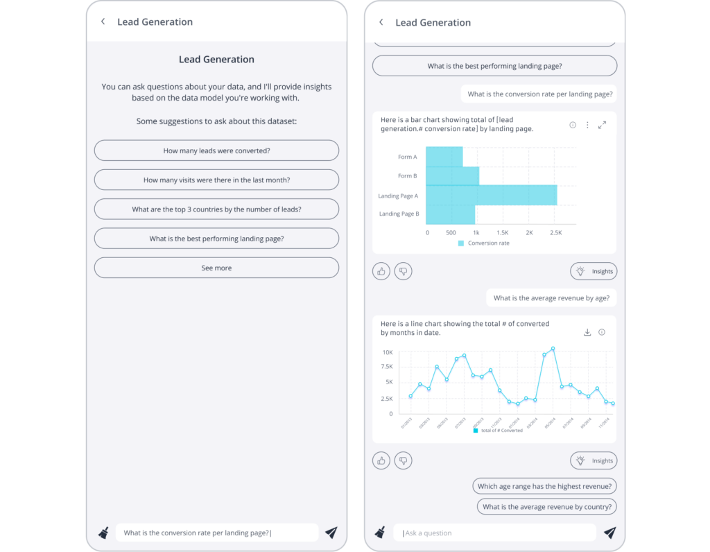 Enable your users to quickly identify insights that are relevant to them. Start them off by suggesting natural language analytical starter prompts based on their data model like “What is my revenue by country?” Let them follow up by asking questions about their scope of analytics such as “What fields can I ask about?” Let the questions flow, such as enabling contextual follow-on prompts later in the conversation, such as asking for narrative guidance, like “Explain these results.” It’s about quickly delivering an end-to-end and ongoing conversational experience around data.