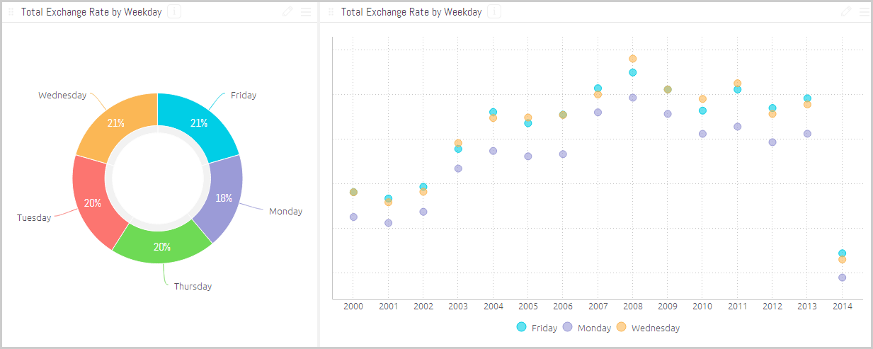 Looking at exchange rate data from years 2000 through 2014, we picked up a pattern that reveals Monday has the lowest total exchange rate (dollar to euro). Monday is therefore the best time to sell dollars and buy euros with a 2-3% lower total exchange rate. On the flip-side, Wednesday and Friday are the best days to sell euros and buy dollars.
