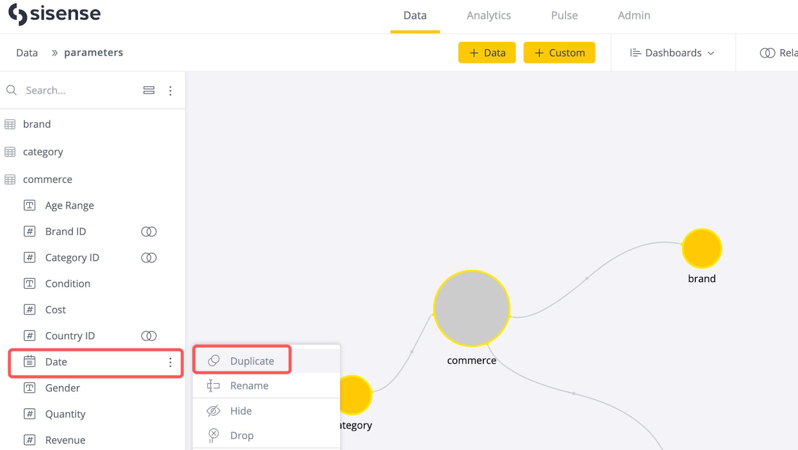 3. Open your data model in the Data tab and duplicate the field that you want to perform a comparative analysis on. For example, duplicate the Date field within the ElastiCube to compare values for two years. Name the new field Date2