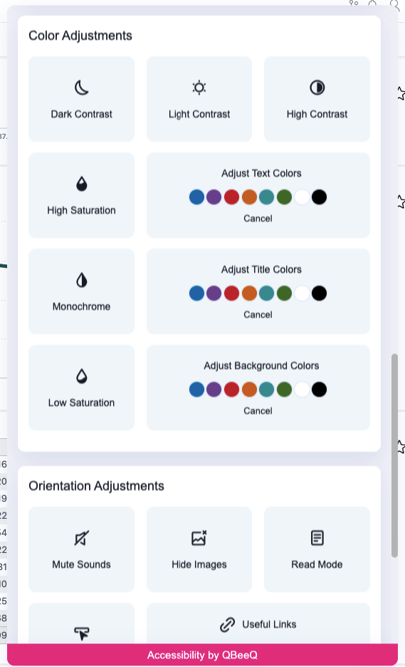 The QBeeQ Accessibility widget is an AI powered app for your Sisense dashboards, or an entire analytics app, which allows users to easily modify the dashboard look and feel depending on their disability. This widget provides any dashboard with support for WCAG and ADA compliance.